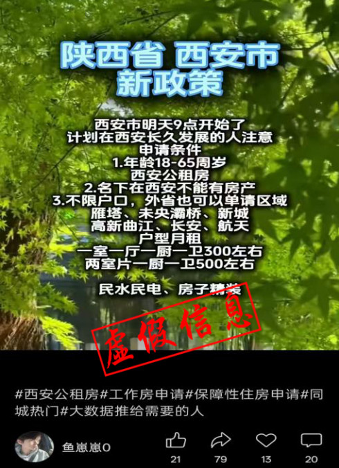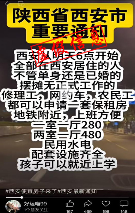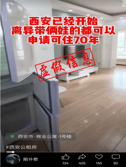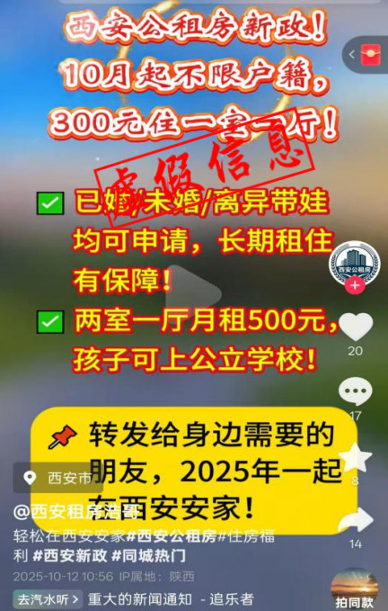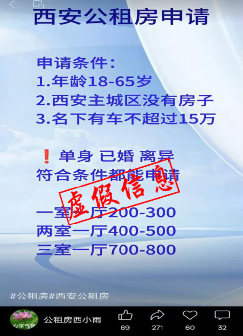 近期,部分不法“自媒体”账号罔顾法律法规,在各类网络平台频繁发布西安公租房虚假信息,通过编造“不限户籍即可长期租住”“付费代办内部指标”“70年产权保障”等不实信息,虚构优惠条件、曲解政策条款,专门误导外来务工人员、中低收入家庭等住房困难群众,不仅导致部分群众遭受财产损失,更严重扰乱了公租房分配管理秩序,损害了住房保障政策的严肃性和政府公信力。
